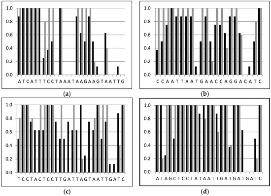Similarity comparison between the specific primers Asco (a); Peri (b); Pristo (c); and Tricho (d) and the non-specific parasitoid (black) or the tortricid host (grey) sequences.