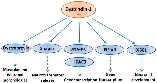 DISC1 is another schizophrenia susceptibility factor playing roles in neuronal development [58]. In neuronal cells, DISC1 forms a complex with dysbindin-1, increases its stability in association with a reduction in ubiquitination and the physical interaction is critical for the process of neurite outgrowth. Furthermore, knockdown of DISC1 or expression of a deletion mutant, effectively decreased the levels of endogenous dysbindin-1. Moreover, the neurite outgrowth defect induced by knockdown of DISC1 was partially reversed by co-expression of dysbindin-1. Taken together, these results indicate that dysbindin-1 and DISC1 form a physiologically functional complex that is essential for neurite outgrowth [59]. Snapin is a binding partner of dysbindin-1 in the brain. Tissue fractionation of whole mouse brains and human hippocampal formations revealed that both dysbindin-1 and snapin are concentrated in tissue enriched in synaptic vesicle membranes and less commonly in postsynaptic densities. Consistent with that finding, localization studies indicated that dysbindin-1 is located in: (i) synaptic vesicles of axonal terminals in the dentate gyrus inner molecular layer and CA1 striatum radiatum; and (ii) postsynaptic densities and microtubules of the dentate neurons and CA1 pyramidal cells [60]. The function of dysbindin-1 in presynaptic, postsynaptic and microtubule locations may all be related to known functions of snapin in regulation of neurotransmitter release [61]. Dysbindin-1 and snapin are components of BLOC-1 and snapin is another binding partner of dysbindin-1 in vitro and in the brain [60]. Deletion in the DTNBP-1 gene causes reduced level of snapin, which is accompanied by defects of synaptic morphology in hippocampal neurons and schizophrenia-like behaviors in mice [62]. Disruption of dysbindin–snapin complex is supposed to affect microtubule assembly, which could contribute to reductions in the neuronal cell size and reduced dendritic density. All of these morphological alterations were frequently observed in schizophrenia [60]. A scheme of the above interactions of dysbindin-1 with several neuronal proteins is shown in Figure 1.