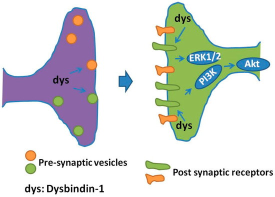 Dysbindin-1 is also a part of biogenesis of lysosome-related organelles complex 1 (BLOC-1) [34], which is involved in the biogenesis of specific components, such as melanosomes and platelet-dense granules, of the endosomal-lysosomal system [35]. In the CNS, BLOC-1 subunits co-localized with synaptic vesicles and synaptosomes derived from synaptic endings [36]; therefore, it was proposed that these BLOC-1 subunits control membrane expression and lysosomal delivery of post-synaptic receptors [37]. As a component of BLOC-1, dysbindin-1 is found primarily in axon or synaptic terminals in the striatum, neocortex, cerebellum and hippocampus [32], brain areas affected in schizophrenic patients. BLOC-1 complex contains many proteins, including pallidin, muted, cappuccino, dysbindin, snapin, blosl, blos2 and blos3 [38]. Mutation or deletion of dysbindin-1 subunit is associated with a destabilization of these proteins of the BLOC-1 complex [37], and defects on the dysbindin-1 complex contribute to synaptic and circuit deficits [36]. Moreover, its deficiency affects the expression of post-synaptic neurotransmitter receptors [37,39,40,41], which are involved in schizophrenia pathogenesis.