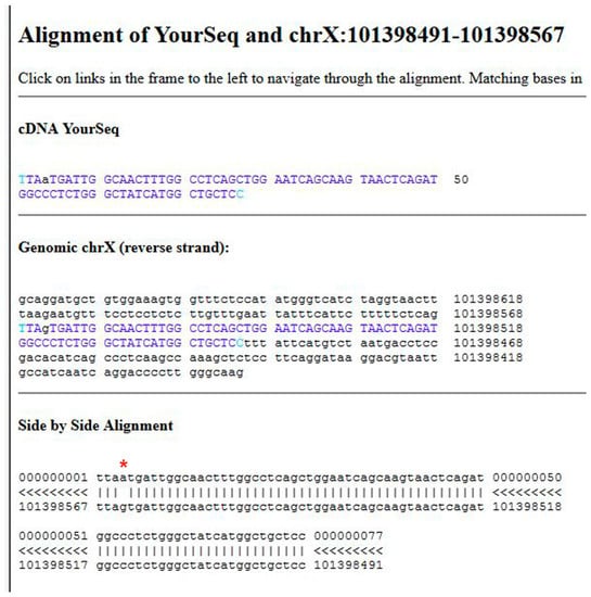 Alignment of the patient’s sequence with the reference genome using BLAT. The transition observed in the GLA gene is indicated by an asterisk.