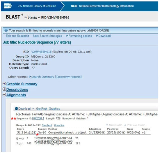 Alignment of the patient’s sequence with the wild-type protein sequence using BLAST. A missense mutation in α-galactosidase A (AGAL) was identified (*). The sequence ID is also highlighted (**).
