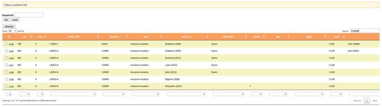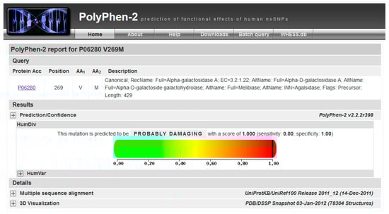 Once the reader has been introduced to the disease and has become acquainted with the main genetic and biochemical aspects, he can move onto disease-specific databases by looking for them in PubMed. Two references point to on-line user-friendly databases. On searching fabry-database.org (Figure 4) the reader learns that this missense mutation in AGAL p.V269M has already been reported in the literature [,,] and is associated to the classic phenotype, thus confirming the prediction of PolyPhen-2. The mutation is also annotated [] in the manually-curated database of disease-associated variants HGMD (The Human Gene Mutation Database) []. It should be remembered that when a new variant, which is not included in any of the data bases of clinical phenotype, is found, it is advisable to perform a biopsy to obtain a definitive diagnosis [].