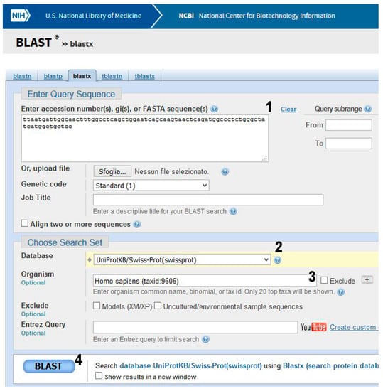 - Enter the patient’s sequence in the query box (Figure 7, point 1), choose UniProt as a database (Figure 7, point 2), and Homo sapiens as the species (Figure 7, point 3).