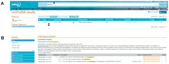 Figure 8. UniProt analysis. (A) input data. (B) a selection of the output, a list of natural variants of AGAL (partial view).
