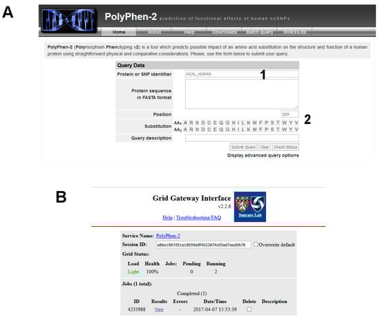 Figure 9. PolyPhen-2 analysis. (A) input data and (B) result status.