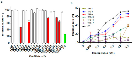 To evaluate the agonistic activity of all selected anti-DR5 scFv antibodies in vitro, the COLO205 cells that are sensitive to TRAIL were used to screen positive clones by 3-(4,5-dimethylthiazol-2-yl)-2,5-diphenyl tetrazolium bromide (MTT) cell viability assay. First, the activity was screened with periplasmic extracts and the five putative DR5 agonistic scFvs were selected by the cell viability assay (Figure 2a). Following this, the five putative DR5 agonistic scFv were transformed into HB2151 cells in order to express the soluble scFv proteins. The obtained yields were in the range of 0.2–3 mg per liter of bacterial culture for the different scFv antibodies. The five scFv antibodies were evaluated more comprehensively in the MTT assay and the two anti-DR5 agonistic scFv antibodies were confirmed (Figure 2b). The most potent anti-DR5 scFv antibody TR2-3 was identified as it inhibited the growth of COLO205 tumor cells with an IC50 of 0.9 μM without any cross-linking agents, which has a favorable comparison to the Apomab scFv in the same assay (IC50 of 0.6 μM).