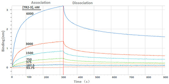 Binding kinetics of TR2-3 to immobilized sDR5 was measured by bio-layer interferometry with the ForteBio Octet QKe System. The determined value of the dissociation constant (KD) was 126 nM (kon 1.15 × 104 M−1s−1; kdis 1.44 × 10−3s−1). These data are representative of at least three independent experiments.