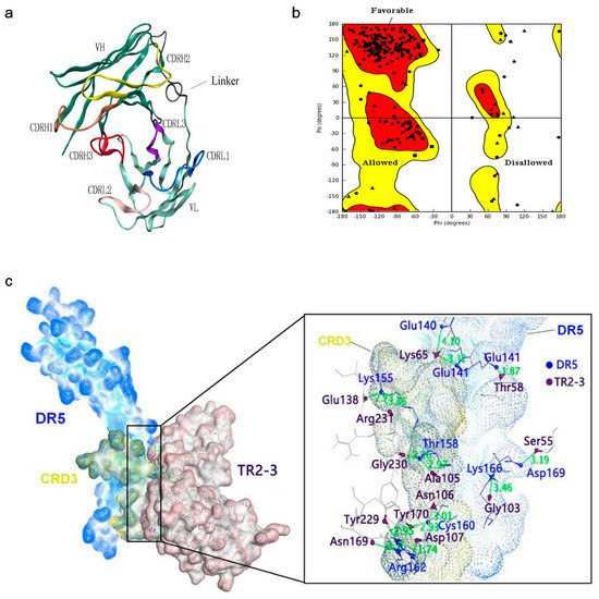 Determination of the kinetic constants of the TR2-3 against immobilized sDR5 demonstrated that the association rate increased with an increase in the concentration of TR2-3 and the kinetic process showed fast association and slow dissociation. According to the calculated results, the value of dissociation constant (KD) was 1.26 × 10−7 M or 126 nM (Figure 4). The same method was also used to test the binding affinity of TR2-3 to DR4 or BSA, with the results having showed that there was no cross-reactivity of TR2-3 with DR4 and BSA (data not shown). Moreover, the binding of TR2-3 to DR5 on the cancer cell surface was confirmed by immunofluorescence analysis (Figure S1). Furthermore, the 3D model of TR2-3 (Figure 5a) was established based on the crystal structures of antibody influenza H5 complex (PDB: 4XNM) and transforming growth factor-β neutralizing antibody GC-1008 (PDB: 3EO0) (for similarity score, the values are 89% and 90%, respectively). The reliability of the structure was evaluated by the Ramachandran plot as Figure 5b. Overall, 96.4% (238/247) of all residues were in allowed regions, whereas 3.6% (9/247) of all residues were in disallowed regions. In addition, the structural model passed the evaluation of Verify_3D and 100% of the residues had an average 3D–1D score > 0.2. These data demonstrated that our established structural model of TR2-3 is stereochemically significant and reliable for docking studies. Schrӧdinger Suite 2009 generated 20 combinations of docking poses and the best conformation pose was selected based on the lowest value of binding energies with −54.64 kcal/mol in Prime MM-GBSA panel (Figure 5c). Following this, we performed MOE (molecular operating environment) protein contact against this TR2-3 and DR5 complex, before identifying 12 stable hydrogen bonds and 3 ions bonds between DR5 and TR2-3 (Figure 5c, Table 3). Thus, the hydrogen bond interactions between DR5 and TR2-3 may be an important element for agonistic activity.