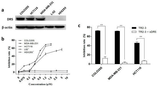 The cytotoxicity of TR2-3 to cancer cells and normal cells. (a) DR5 expression level of each cell line was detected by Western blot. Whole-cell lysates from the indicated cell lines were analyzed using antibodies specific to DR5. β-actin was shown as a loading control; (b) Cell lines were incubated with TR2-3 at the indicated concentrations for 48 h. # indicates an incubation time of 72 h; (c) Cells were incubated with 1.2 μM TR2-3 as well as with 1.2 μM or without soluble DR5. Cell viability was measured by MTT assay. The data represent mean growth inhibition as a percentage of untreated cells in each cell line (** p < 0.01, t-test). These data are representative of at least three independent experiments.
