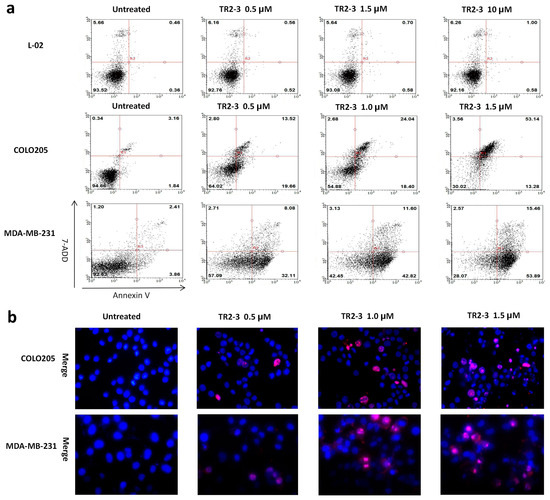 The apoptosis inducing activity of TR2-3 detected in cancer cells and normal cells. COLO205 and MDA-MB-231 cells were treated with 0.5, 1.0, and 1.5 μM or without TR2-3 for 4 h. L-02 cells were treated with a concentration of 1.0, 1.5 and 10 μM or without TR2-3 for 72 h. (a) Treated cells were stained by Annexin V-FITC and 7-AAD, counted by flow cytometer (10,000 cells per sample); (b) Cells were subjected to Hoechst 33342 (in blue) and propidium iodide (in red) dual staining assays and imaged under a fluorescence microscope (400×). These data are representative of at least three independent experiments.