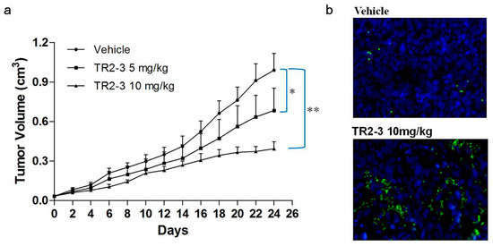 TR2-3 inhibits tumor growth in vivo. COLO205 cells were injected subcutaneously (1 × 106 cells/mouse) to BALB/c nude mice. After eight days, mice were administered PBS as a control or were administered TR2-3 (10 mg/kg) by intraperitoneal injection. (a) Each time point represents the mean value of the tumor size on that day as measured by a caliper ruler. Compared with the control, TR2-3 showed a statistically significant higher rate of tumor inhibition (* p < 0.05, ** p < 0.01 for the t-test); (b) Representative Immunofluorescence staining of cleaved caspase-3 in sections from the study in (a) Cleaved caspase-3 positive cells were visualized in green under a fluorescence microscope (400×) and the cell nuclei were stained with DAPI in blue. These data are representative of at least three independent experiments.