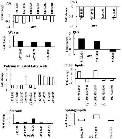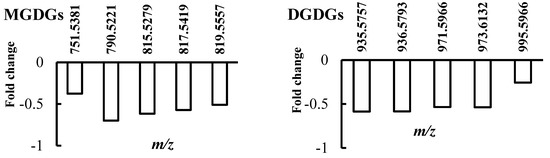 Lipid composition changes in sensitive thyme plants under drought conditions. After water withholding, thyme leaves were harvested and non-polar extracts analyzed by direct infusion Fourier transform ion cyclotron resonance (DI FT-ICR) mass spectrometry. Vertical axis represents the fold change between the control and stressed plants. The mass-to-charge (m/z) values are reported next to each bar (abbreviations: MGDGs, monogalactosyldiacylglycerols; DGDGs, digalactosyldiacylglycerols; PS, phosphatidylserine; PG, phosphatidylglycerol; PC, phosphatidylcholine).
