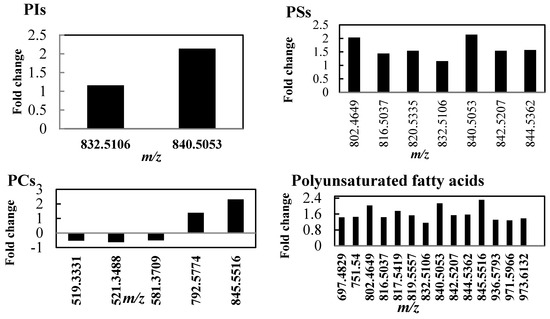 Lipid composition changes in tolerant thyme plants under drought conditions. After withholding water, thyme leaves were harvested and non-polar extracts were analyzed by DI FT-ICR mass spectrometry. The vertical axis represents the fold change between the control and stressed plants. The mass-to-charge (m/z) values are reported next to each bar (abbreviations: PI, phosphatidylinositol; PS, phosphatidylserine; PC, phosphatidylcholin; DGDGs, digalactosyldiacylglycerols; MGDGs, monogalactosyldiacylglycerols).