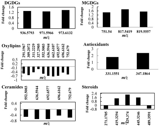 A full list of identified non-polar metabolites significantly changed in tolerant thyme plants under water deficit condition is reported in Table S2. Changes in the intensities of lipids in plants under watered and drought conditions are shown in Figure 3. Though the levels of major lipids increased in stressed plants, indicating an increase in lipid biosynthesis and/or a decrease in lipid degradation, a dramatic decrease was observed in the intensities of stress-induced lipids (oxylipins). Among the detected phospholipids, including phosphatidylinositol (PI), PS, and phosphatidylcholine (PC), the metabolites with m/z values of 519.3331, 521.3488 and 581.3709 decreased by 50–60%, whereas those with m/z values of 845.5516, 840.5053, and 840.5053 were the most affected phospholipids, increasing by over 200% in response to drought stress. The amounts of other phospholipids were also increased in the stressed plants as compared with the watered controls.