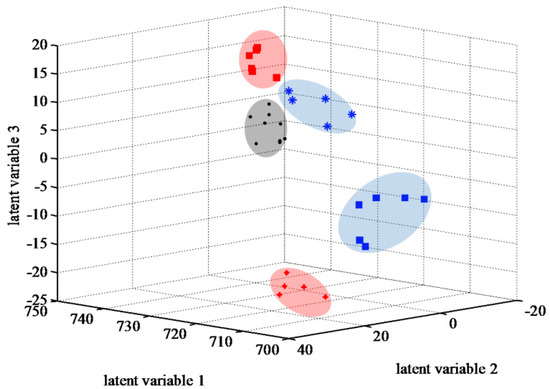 Before principal component analysis (PCA), data set normalization was performed based on the probabilistic quotient normalization (PQN) method [33] to reduce the effect of extreme peak intensities. Next, the data matrix was treated using the K-nearest neighbor (KNN) imputation technique [34,35] to estimate the missing values. Finally, the samples were transformed using the generalized log transformation (GLog) method [36] to remove the domination of the highest intensity peaks through stabilizing the whole variance. PCA was then performed using MATLAB software and PLS Toolbox, which is an unsupervised approach, and the obtained information represents any structure correlated to the data. Indeed, PCA converts data into a simple visual format. The PCA score plot is based on similarities or differences in each sample, which are due to their concentrations or compositions. Each mass spectrum in score plot is converted to one point in the space of principal components. In PLSDA, a supervised method, the loading plot represents the relative contribution of each m/z value, corresponding to one metabolite, to the principal components. Therefore, it shows m/z values of metabolites responsible for discrimination among classes in score plot. The identification of important metabolites depends on determining the latent variables responsible for class separation.