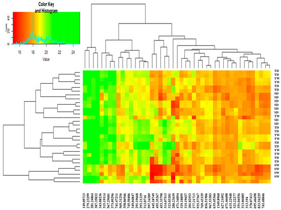 Heat maps were used for data visualization [32,33,34]. Based on the heat map analysis, all metabolites in the SD and TD groups were affected by drought stress, with a significant difference in their changing patterns (Figure 6). Metabolites with m/z values of 149.07713, 279.23299, 281.24864, and 367.35832 showed the highest intensities in all four groups and were not affected by water deficit in either sensitive and tolerant plants. Consequently, these metabolites did not seem to be involved in the stress response mechanisms of thyme plants. While intensities of most metabolites changed following stress (both in tolerant and sensitive groups) as compared to the corresponding watered plants, dramatic changes in concentrations of some metabolites were recorded. For instance, the intensities of the m/z values 323.03281 and 323.22277 significantly increased in the tolerant plants under drought conditions as compared to the control ones. In contrast, metabolites with m/z values of 597.34385 and 314.07513 decreased in the stressed plants as compared to the watered groups. Other stress-induced changes in metabolite intensities were documented in sensitive thyme plants, i.e., an increase of m/z values 597.34384, and 323.03281 and decrease of m/z values 343.08236 and 291.19366 in stressed plants as compared to the controls.