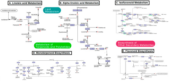 In the linoleic acid metabolic pathway, (10E,12Z)-9-oxooctadeca-10,12-dienoic acid (9-oxoODE), γ-linolenate, linolenate, cepenynate, 13-oxooctadeca-9,11-dienoic acid (13-oxoODE), and 9-cis,11-trans-octadecadinoate changed significantly following drought stress (Figure 7A, red circles). In the α-linolenic acid pathway, significantly altered metabolites included α-linolenic acid, 17-hydroxy linolenic acid, (9S,10E,12Z,15Z)-9-hydroxyoctadeca-10,12,15-trienoic acid (9S-HOTrE), 9, 10 EOTrE, colnelenic acid, 8-[(1S,5S)-2-oxo-5-[(Z)-pent-2-enyl]cyclopent-3-en-1-yl]octanoic acid (10-OPDA), 2(R)-HOTrE, etherolenic acid, 12-oxo-cis-10, cis-15-phytodienoic acid (12 OPDA), and 8-[3-oxo-2-[(Z)-pent-2-enyl]cyclopentyl]octanoate (OPC8), 12,13-EOTrE (Figure 7B, red circles). In the isoflavonoid biosynthetic pathway, 7,4-dihydroxy-flavone, calycosin, vestitone, 2-hydroxy-formonentin, pisatin, maackiain, 2,6,7,4-tetrahydroxy-isoflavanone, glycitein, 2-hydroxy-2,3-dihydrogenistein, prunetin, biochanin, and 2,3-dihydrobiochanin A significantly changed following water deficiency (Figure 7C, red circles). The monoterpenoid metabolic route showed significantly altered levels of S-limonene, R-limonene, α-pinene, pinocarvone, myrtenal, 4S-carvone, 4R-carvone, iso-pipenitenone, and perillyl aldehyde (Figure 7D, red circles). Finally, subsequent to water deficit, flavonoid biosynthesis also showed significant changes in pinobanksin 3-acetate, chrysin, dihydrofisetin, 7,4-dihydroxy flavone, dihydrokaempferol, pentahydroxychalcone and eriodictyol (Figure 7E, red circles).