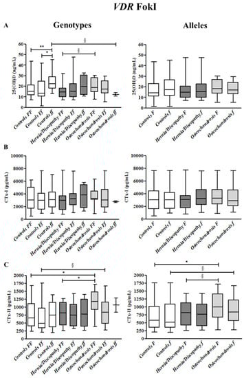 25hydroxyvitamin D (25(OH)D) (A), cross-linked C-telopeptides of type I collagen (CTx-I) (B), and cross-linked C-telopeptides of type II collagen (CTx-II) (C) plasma concentrations in controls and in the subgroups of patients with hernia/discopathy and osteochondrosis, distributed according to FokI VDR genotypes/alleles. The box and whisker plots show the median, 25th, and 75th percentile (interquartile) (the box), and minimum and maximum value (the whiskers). * p < 0.05. ** p < 0.01. § indicates a tendency.