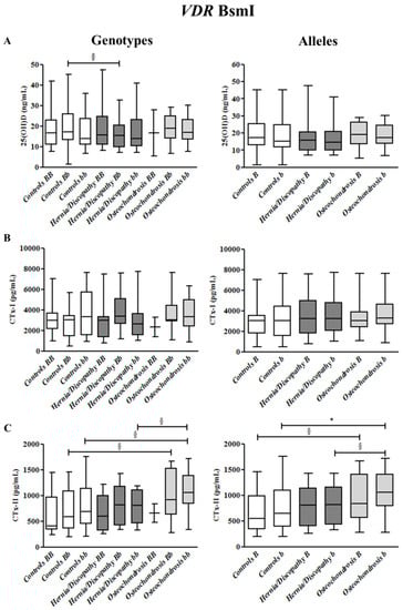 25hydroxyvitamin D (25(OH)D) (A), cross-linked C-telopeptides of type I collagen (CTx-I) (B), and cross-linked C-telopeptides of type II collagen (CTx-II) (C) plasma concentrations in controls and in the subgroups of patients with hernia/discopathy and osteochondrosis, distributed according to BsmI VDR genotypes/alleles. The box and whisker plots show the median, 25th and 75th percentile (interquartile) (the box), and minimum and maximum value (the whiskers). * p < 0.05. § indicates a tendency.