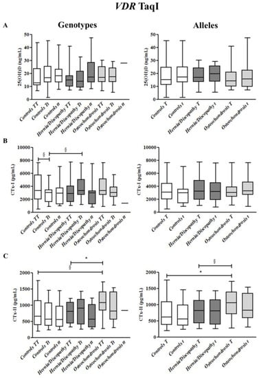 25hydroxyvitamin D (25(OH)D) (A), cross-linked C-telopeptides of type I collagen (CTx-I) (B), and cross-linked C-telopeptides of type II collagen (CTx-II) (C) plasma concentrations in controls and in the subgroups of patients with hernia/discopathy and osteochondrosis, distributed according to TaqI VDR genotypes/alleles. The box and whisker plots show the median, 25th, and 75th percentile (interquartile) (the box), and minimum and maximum value (the whiskers). * p < 0.05. § indicates a tendency.