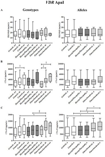 25hydroxyvitamin D (25(OH)D) (A), cross-linked C-telopeptides of type I collagen (CTx-I) (B), and cross-linked C-telopeptides of type II collagen (CTx-II) (C) plasma concentrations in controls and in the subgroups of patients with hernia/discopathy and osteochondrosis, distributed according to ApaI VDR genotypes/alleles. The box and whisker plots show the median, 25th and 75th percentile (interquartile) (the box), and minimum and maximum value (the whiskers). * p < 0.05. § indicates a tendency.