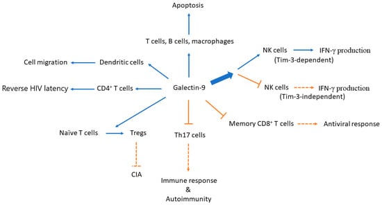 A simplified diagram illustrates the effects of galectin-9 on immune cells and the potential consequences. Expression of a proteolysis-resistant galectin-9 construct induces apoptosis in immune cells as well as in malignant cells. Galectin-9 causes the differentiation of naive T cells to Tregs and inhibits differentiation towards T helper (Th)17 cells. Both effects lead to the inhibition of the development of immune response and autoimmune arthritis in a CIA animal model. While treatment with recombinant human galectin-9 induces IFN-γ production in a Tim-3-overexpressing NK cell line and in Tim-3+ primary NK cells induced with low-dose IL-12 and IL-18, galectin-9 ligation has also been shown to reduce the proportion of IFN-γ-producing NK cells stimulated with IL-12/IL-15 in a Tim-3-independent manner. Galectin-9 treatment extensively regulates gene expression of molecules involved in the processes of human immunodeficiency virus (HIV) latency. Galectin-9 may also regulate dendritic cell migration in the example of dengue virus (DENV) infection. NK, natural killer; CIA, collagen-induced arthritis; IFN-γ, interferon-γ; and, Tregs, regulatory T cells. Blue arrow: induce; bold blue arrow: simply means there are two diverging effects out of this direction; orange T-bar arrow/orange dotted T-bar arrow: inhibit; orange arrow with dotted line: reduce.