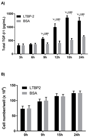 The optimal concentration of exogenous LTBP-2 was determined by testing a range of concentrations from 1 to 12.5 µg/mL. The level of TGF-β1 expression appeared to saturate at a LTBP-2 concentration of around 10 µg/mL, with TGF-β1 elevated around fourfold above the BSA control (Figure S1). This concentration was used for all subsequent experiments unless stated otherwise. An experiment was then conducted to determine the duration and peak for elevated TGF-β1 following LTBP-2 stimulation. After an addition of exogenous LTBP-2, the TGF-β1 content of the medium was measured at intervals over 24 h (Figure 3A). A significant increase in TGF-β1 above controls was first observed after 9 h. At the 12 h time point, the LTBP-2-treated cells showed around a twofold increase in TGF-β1 above controls, which rose to threefold at 15 and 24 h. Since TGF-β1 secretion was significantly higher by control cells at 24 h compared to 15 h, the TGF-β1 levels appeared to peak at around 15 h. No significant differences were found in cell numbers in the LTBP-2-treated cultures and untreated controls, although the cell count in all cultures had doubled after 24 h of incubation (Figure 3B). Therefore, the LTBP-2-induced stimulation of TGF-β1 secretion was not due to a greater increase in cell number in the LTBP-2-treated cultures.