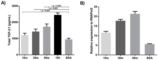 Total RNA was extracted from cells using trizol (Invitrogen, California, CA, USA), following the manufacturer’s instructions. RNA samples were treated with DNase 1 (RQ1 DNase, Promega, Fitchburg, WI, USA) and recovered using the RNEasy Mini Kit (Qiagen, Düsseldorf, Germany). Total RNA (1 µg) was reverse transcribed using Superscript III (Invitrogen, Carlsbad, CA, USA). The cDNA was PCR-amplified using a SYBR-Green kit (Qiagen). Primer sequences (forward and reverse respectively) were as follows: TGF-β 5′-CTCCGAGAAGCGGTACCTGAAC-3′, and 5′-CACTTGCAGTGTGTTATCCCT-3′; LTBP-2 5′-GGGCACCGCACCACCTACACG-3′ and 5′-TCATCACACTCATTCACATCTACG-3′; RNAPolII 5′-AGGGGCTAACAATGGACACC-3′ and 5′-CCGAAGATAAGGGGAACTACT-3′. The housekeeping gene RNAP2 was used as the internal standard. PCR was performed with a hot start at 95 °C for 10 min, followed by 40 cycles of denaturation at 95 °C for 20 s, annealing at 60 °C for 20 s, and extension at 72 °C for 45 s.