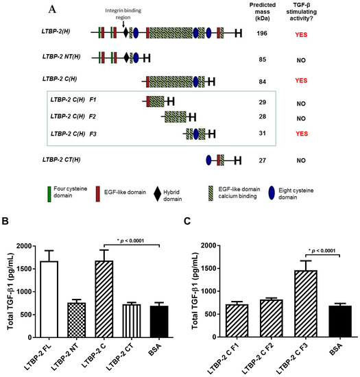 Subsequently, three sub-fragments F1, F2, and F3, spanning fragment LTBP-2C(H), were tested in a TGF-β1 bioassay. Only fragment F3, consisting of an 8-Cys motif flanked by two pairs of EGF-like repeats, caused a significant increase in TGF-β1 secretion above control cells, indicating that it contained the TGF-β1 stimulating activity (Figure 5C). This region has no known cellular or molecular interactions, although it is adjacent to a region containing heparin and fibroblast growth factor-2 (FGF-2) binding activities (Fragment F2) [29,30].