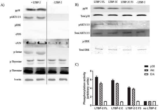 To determine the signalling pathways involved in the stimulation of TGF-β1 expression, we examined the effects of LTBP-2 on the phosphorylation of serine, tyrosine, and threonine generally and on targeted individual signal pathways, namely cJUN, cFOS, AKT1/2/3, ERK, and p38 MAPK. These signalling molecules were selected to cover the main pathways commonly used by integrins, growth factors, and cytokine receptors. Western blotting (Figure 6A) showed that the treatment of MSU-1.1 cells with LTBP-2 (1 µg/mL) for 30 min increased the phosphorylation of serine, threonine, cJUN, Akt1/2/3, and p38 MAPK. However, we observed no increase in tyrosine, cFOS, and ERK phosphorylation. Thus, LTBP-2 seems to specifically activate signalling molecules containing phospho-serine and threonine, and pathways involving AKT and p38 MAPK. The experiment was repeated using bioactive fragment LTBP-2C and sub-fragment LTBP-2CF3 in place of full-length LTBP-2. Phosphorylation was quantitated relative to the no LTBP-2 control after normalisation to the total signal molecule present. The bioactive fragments activated Akt and p38 MAPK signalling but not ERK, similar to full-length LTBP-2 (Figure 6B,C), leading to the hypothesis that LTBP-2 may stimulate TGF-β1 expression by activating these two signalling pathways.