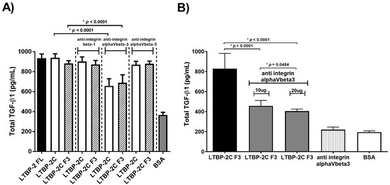 To determine if an integrin was involved in the upregulation of TGF-β, a range of established blocking antibodies was tested in the LTBP-2 stimulation assay (Figure 8A). Antibodies to the β1 and αVβ5 integrins had no effect on LTBP-2 upregulation of TGF-β1, indicating that the large family of β1 integrins and αVβ5 integrin were not evidently involved in the process. Intriguingly, the anti-αVβ3 integrin antibody (10 µg/mL) showed partial inhibition of the TGF-β1’s upregulation. In a subsequent experiment, doubling of the anti-αVβ3 antibody concentration and reducing the concentration of LTBP-2F3 10-fold showed only a very minor further attenuation, suggesting that the inhibitory effect of the antibody was close to saturation (Figure 8B). Even under these conditions, LTBP-2 still elevated TGF-β levels to double the amount in control cultures. This suggested that αVβ3 integrin alone was not responsible for the signal transmission and that another primary receptor was involved, perhaps in conjunction with αVβ3, to mediate TGF-β1 upregulation by LTBP-2.