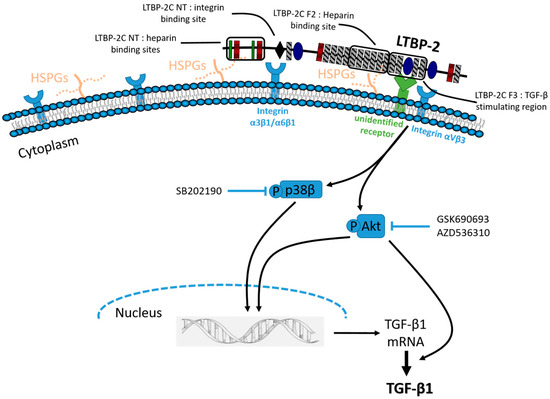 It is interesting that full-length LTBP-2 and the larger fragment LTBP-2C caused a stronger activation and phosphorylation of the Akt and p38 MAPK signalling pathways than the smaller fragment LTBP-2 F3. This suggests that a region adjacent to F3 may enhance its signalling properties, perhaps by positively influencing the binding of LTBP-2 to the cell surface. A candidate molecule for this is a cell surface HSPG. Various HSPGs are found at the cell surface and/or the extracellular matrix and play important roles as cell receptors and co-factors, and they can act in conjunction with integrins to modulate cell behaviour and signalling outcomes, often through growth factor receptor signalling pathways [33,35,55]. Interestingly, our recent studies revealed that LTBP-2 binds strongly to HSPGs, including cell-signalling, transmembrane syndecan-4, with multiple binding sites within the N-terminal region of LTBP-2 and one site (in fragment LTBP-2F2) adjacent to the TGF-β stimulating region (fragment LTBP-2F3) [30]. Binding of LTBP-2 to HSPG via this adjacent site may explain the stronger signalling invoked by full-length LTBP-2 and fragment LTBP-2C than by LTBP-2F3, which lacks HSPG-binding activity. The concepts are illustrated schematically in Figure 9. Further research is needed to elucidate the full nature of LTBP-2 interaction(s) with the cell surface required for TGF-β1 upregulation.