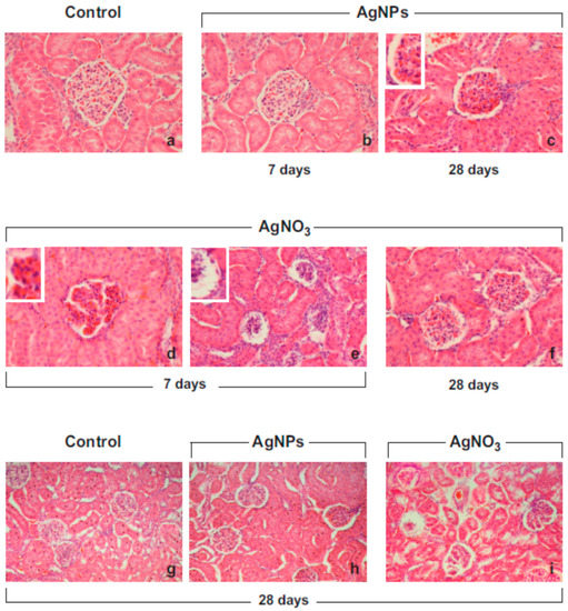 Figure 2. Representative H&E-stained cortical renal specimens from control animals (a,g) and rats exposed to AgNPs (b,c,h) or AgNO3 (df,i), 7 and 28 days post-instillation. The physiological renal structure is clearly well preserved in control rats (a,g), while moderate morphological alterations are manifest in the renal cortex of the treated animals, at both evaluated time points. Seven days post-i.t., the dilatation of the intercapillary and peripheral Bowman’s space was observed (b,d,e), often accompanied by glomerular shrinkage (d); these effects were still evident after both treatments at day 28 (c,h for AgNPs and f, i for AgNO3) accompanied by the appearance of several glomerular areas of interstitial micro-hemorrhages. Objective magnification: 40× (ad,f); 20× (e), 10× (gi).