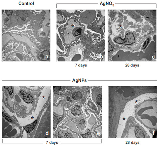 Figure 3. Transmission electron microscopy images (UA & LC staining) showing moderate renal cortical alteration 7 and 28 days after AgNP- and AgNO3-instillation. The evident dilatation (asterisks) of the intercapillary and peripheral Bowman’s space (d,f) is shown together with shrinkage of both mesangial cells and glomerular capillaries; endothelial and podocytic cells appeared damaged (b,c, asterisks), the latter showing the podocyte foot processes scarcely developed (e). Occasional expression of cell injury, namely apoptotic cell death and cytoplasm segmentation are also presented (b,c). Original magnification: ×4400 (ac); ×3000 (df).
