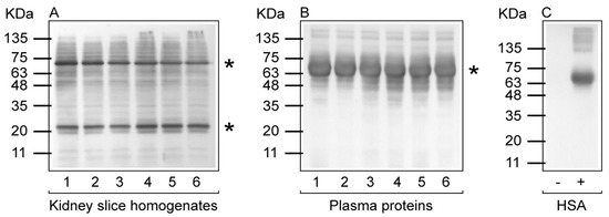 Kidney (10 µg) and plasma proteins (5 µg) were fractionated on 12% (w/v) reducing SDS-PAGE gels and electroblotted onto a polyvinylidene difluoride (PVDF) membrane. Protein carbonylation was detected, after derivatization with DNPH, with anti-DNP antibodies specific for the 2,4-dinitrophenyl hydrazone–protein adduct by Western blot immunoassay [59,60,61]. In particular, PVDF membranes were subsequently incubated in 2 M HCl and DNPH (0.1 mg/mL in 2 M HCl) for 5 min each. Membranes were then washed three times in 2 M HCl and seven times in 100% methanol for 5 min each, followed by one wash in PBST (10 mM Naphosphate, pH 7.2, 0.9% (w/v) NaCl, 0.1% (vol/vol) Tween-20) and blocking for 1 h in 5% (w/v) nonfat dry milk in PBST. After washing three times with PBST for 5 min each, carbonyl formation was probed by 2-h incubation with 5% milk/PBST containing anti-dinitrophenyl-KLH (anti-DNP) antibodies (1:10,000 dilution). After three washes with PBST for 5 min each, the membrane was incubated with a 1:40,000 dilution of the secondary antibody linked to horseradish peroxidase in 5% milk/PBST for 1 h. After washing three times with PBST for 5 min each, immunostained protein bands were visualized with enhanced chemiluminescence detection. Protein bands on PVDF membranes were then visualized by washing the blots extensively in PBS and then staining with amido black.