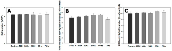 Cell count was approximately 6.4 × 104 for cells grown under control conditions, 6.5 × 104 for cells exposed to α-MSH only, 6.4 × 104 for cells exposed to 30 Hz, 6.5 × 104 for cells exposed to 50 Hz, 6.4 × 104 for cells exposed to 60 Hz, and 6.5 × 104 for cells exposed to 75 Hz. Thus, ELF-EMF exposure did not significantly affect cell proliferation (Figure 3A).