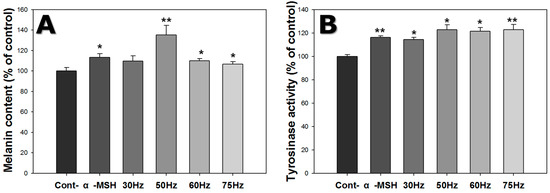 The amount of melanin in melanocytes was investigated by the melanin content assay, as shown in Figure 4A. Melanin content increased 1.1-fold on average, for cells exposed to ELF-EMFs. Melanin content of cells exposed to ELF-EMF at 50 Hz was 1.3 times the controls, and 1.1 times the cells exposed to α-MSH only. Thus, ELF-EMFs induced increased melanogenesis.