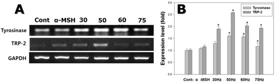 Melanocyte tyrosinase activity increased after exposure to EMFs at 50–75 Hz, as shown in Figure 4B, and PCR and western blot analysis confirmed that the expression of tyrosinase increased at both the gene and protein levels, after exposure to 50 and 60 Hz. The expression of TRP-2 was significantly increased at 50 Hz (Figure 5 and Figure 6).