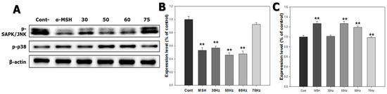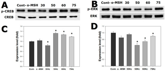 Melanocyte tyrosinase activity was assessed using the tyrosinase activity assay, as shown in Figure 4B. Tyrosinase activity increased in cells exposed to ELF-EMFs. Cells exposed to 50 and 75 Hz were 1.2 times the controls, and 1.1 times those exposed to α-MSH only. Therefore, ELF-EMF exposure increased tyrosinase activity.