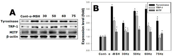 We investigated MITF protein expression level using western blotting. MITF protein expression increased with exposure to ELF-EMF at 50–60 Hz, which correlated with tyrosinase and TRP-1 expression. A previous study reported increased MITF and tyrosinase expression from physical stimulation of melanocytes [35]. The authors of that study demonstrated the effects of NB-UVB on the maturation of the melanocyte lineage differentiated from hair follicle-derived neural crest stem cells in vitro. NB-UVB increased the expression of MITF and tyrosinase during melanocytic differentiation and is currently used in clinical vitiligo phototherapy.