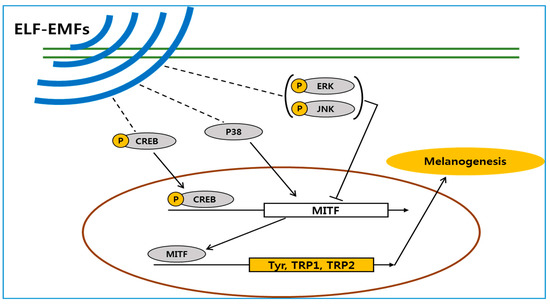 We have demonstrated that ELF-EMFs can induce melanogenesis in melanocytes. Exposure to ELF-EMFs was associated with increases in the level of p-CREB and p-p38, also inhibited of phosphorylated extracellular signal-regulated protein kinase and phosphorylated stress-activated protein kinase/c-Jun N-terminal kinase. As a results, MITF was upregulated and it’s upregulation enhances the expression of the melanogenesis-related genes tyrosinase, TRP-1, and TRP-2, and stimulates melanin synthesis at 50 Hz (Figure 10).