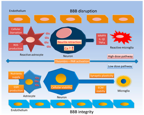 Thrombin effects at low and high doses. At low doses, astrocytes lose their star morphology maintain their fundamental role in nutrient supply, glutamate (Glu) sinking, and glutathione (GSH) production, thus promoting cell survival and synaptic plasticity; the blood–brain barrier (BBB) and extracellular matrix (ECM) both maintain their stability. At high doses, reactive astrocytes and microglia proliferate, lose their Glu regulatory function, and produce reactive oxygen species (ROS) and inflammatory cytokines (interleukin 1β (IL-1β), tumor necrosis factor α (TNFα)); neurons suffer neurite retraction, intracellular Ca2+ upregulation, and finally cell death, while the BBB is damaged and the ECM is digested by matrix metalloproteinases (MMPs).