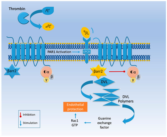 The aPC-mediated Rac1 activation is β arrestin 2-related. Indeed, aPC works as a β arrestin “biased” agonist of PAR and does not activate G protein signaling [58]. The missing link between β arrestin and the GTPase activation seems to be produced by disheveled 2 (Dvl-2), usually associated with frizzled receptors (FZD) [58] (Figure 2).