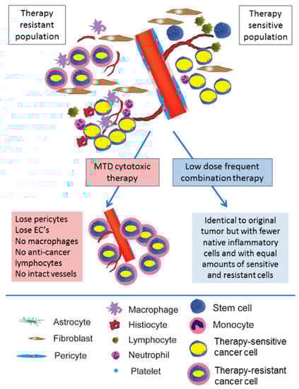 Cancer cells depend on supporting stroma to provide pro-angiogenic signaling that would allow the formation of blood vessels needed for recruiting nutrients and oxygen [27,39,40]. However, stromal cells, such as fibroblasts and pericytes, can be more sensitive to chemotherapeutic agents and can also be damaged by doses that are not harmful to cancer cells [3]. Therefore, targeting tumor stroma would inflict equal damage on the supply compartment that supports both sensitive and resistant cells [21]. This can weaken the entire tumor population without selecting for resistant clones, particularly in combination with other treatment modalities [24,41,42,43,44,45].