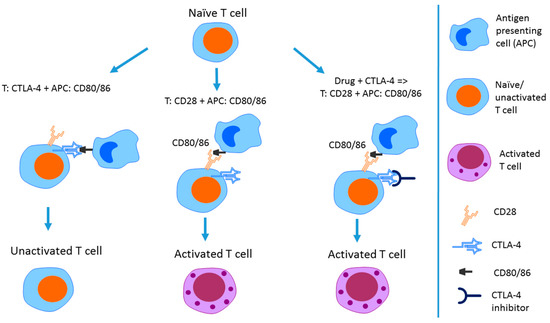 Activation of naïve T cells is mediated by interactions with antigen-presenting cells (APCs), such as dendritic cells, which result in the formation of specialized structures at points of APC and T cell contact (immunological synapses) [69]. T cells express proteins on the cell surface that provide co-stimulatory signals to activate or suppress T cell activation and survival, including cluster of differentiation 28 (CD28) and CTLA-4. Binding of CD80 or CD86 receptors on the APC surface to CTLA-4 on T cells results in blocking T cell activation. Alternatively, binding of CD80/86 to T-cell receptor CD28 results in increasing T cell activation [68,70,71]. Pharmacological blockade of CTLA-4 gives a competitive advantage to CD28, resulting in increased T cell activity. This mechanism is summarized in Figure 2.