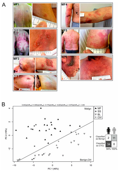 CTCL-MF patients and miR-classifier for CTCL plasma. (A) Photographs of the lesions in MF patients (MF1-7). Each panel shows a larger view of the lesion and its detail; (B) Principal component analysis (PCA) analysis of the miR-classifier in CTCL, benign lesions (BL) and healthy donors using expression data of miR-155, miR-203, miR-205, miR-22, miR-223, miR-103, and miR423-5p. A line separating the CTCL from BL is defined in the Results section. MF: dark triangle, SS: grey rectangle, BL: empty triangle, and controls are indicated by a cross. The arrows indicate two CR samples of one patient. (B) Right: classification performance in the training set using the progressive sampling algorithm called NSC (specificity 100%, sensitivity 94%) in which the dark field represents samples correctly diagnosed as malignant, the grey field represents samples correctly diagnosed as benign, and empty fields represent samples that are falsely diagnosed. Dark person icon: CTCL; grey person icon: BL.