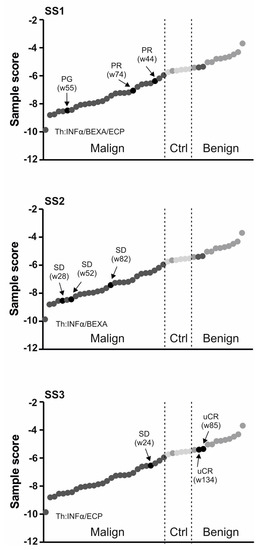 Plasma 3-miR-score in SS patients. Clinical data (SS1-3) are indicated including the therapy (Th) & response (see Table 1). For each sample the time in weeks (w) is calculated from the diagnosis. Each sample represented by a circle: empty healthy, grey BL, dark CTCL. Dashed lines separate diagnostic subgroups. Arrows indicate consecutive samples of a patient whose ID is placed on top.