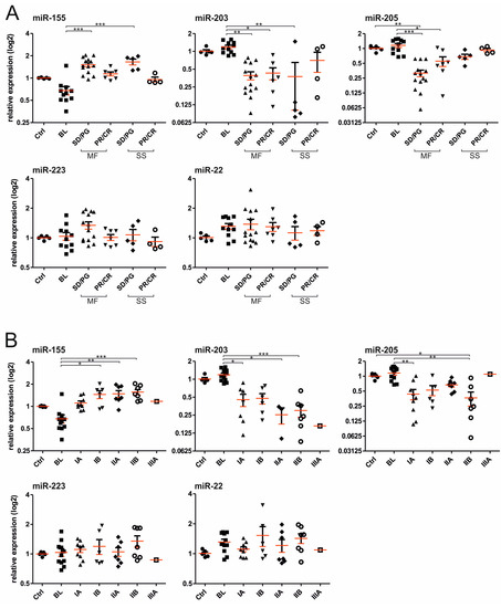 To further understand which miRs added the most to the miR-classifier, we display the data of each miR separately in the Figure 3. The data indicate that the miR-155 was significantly upregulated in both MF, as well as SS patients compared to BLs. Correspondingly, levels of miR-203 and miR-205 were significantly downregulated in the CTCL plasma. We also divided the patients’ samples according to the therapy response and observed the trends in reduction of miR-155, as well as the increase of the miR-203 and 205 in patients with the therapy response (partial remission (PR)/CR) for both MF and SS (Figure 3A). The levels of miR-223 and miR-22 were on average not significantly changed compared to controls but the data distribution was slightly more heterogeneous. Next, we show the miR levels (Figure 3B) in respect to clinical stages according to ISCL/EORTC for MF/SS as defined elsewhere [7]. The trends of increasing miR-155 and the reciprocal decreases of miR-203 and miR-205 are observable at higher stages. This is particularly noted between stage I (patches, papules, and plaques) and II (tumour > 1 cm, or lymph node involvement). Again, no trends were noted for miR-223 and miR-22 and staging. Therefore, the miR-classifier separated patients with CTCL compared to controls and BLs and further indicated that patients with increased tumour burden have higher levels of miR-155, and lower levels of miR-203 and miR-205. Upon responding to the therapy, the levels of miR-155, miR-203, and miR-205 tend to normalize, which became the subject of our next analyses.