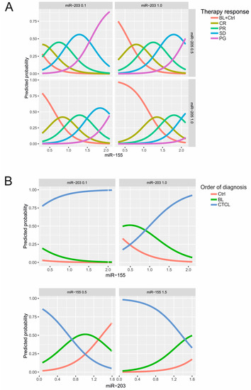 Predicted probability of therapy response and diagnosis based on miR levels. (A) Predicted probability that a patient has a particular therapy response (CR, PR, SD, PG) or belongs to the BL/healthy control. The X-axis provides miR-155 level at certain levels of either miR-203 (0.1 vs. 1.0) or miR-205 (0.5 vs. 1.0); (B) predicted probability that a patient is healthy, benign, or malignant (Ctrl < BL < CTCL, i.e., ordered diagnosis) based on the ordered logistic regression model. Increasing miR-155 (X-axis) increase the probability of belonging to the CTCL category seen at two levels of miR-203. Bottom panel: accordingly, decreasing miR-203 (X-axis) increase the probability of belonging to the CTCL category seen at two levels of miR-155 (0.5 vs. 1.5).