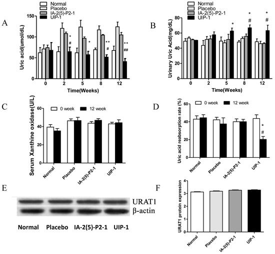 Effect of UIP-1 on the uric acid metabolism. (A) The level of serum uric acid; (B) The level of urine uric acid; (C) The concentration of serum xanthine oxidase; (D) Determination of uric acid absorption rate. (E,F) WB analysis was used in kidney tissue to quantify the expression of URAT1 proteins. Values are expressed as the mean ± SEM of data. * p < 0.05, ** p < 0.01, UIP-1 versus placebo group. # p < 0.05, ## p < 0.01, UIP-1 versus IA-2(5)-P2-1 group, one-way ANOVA.